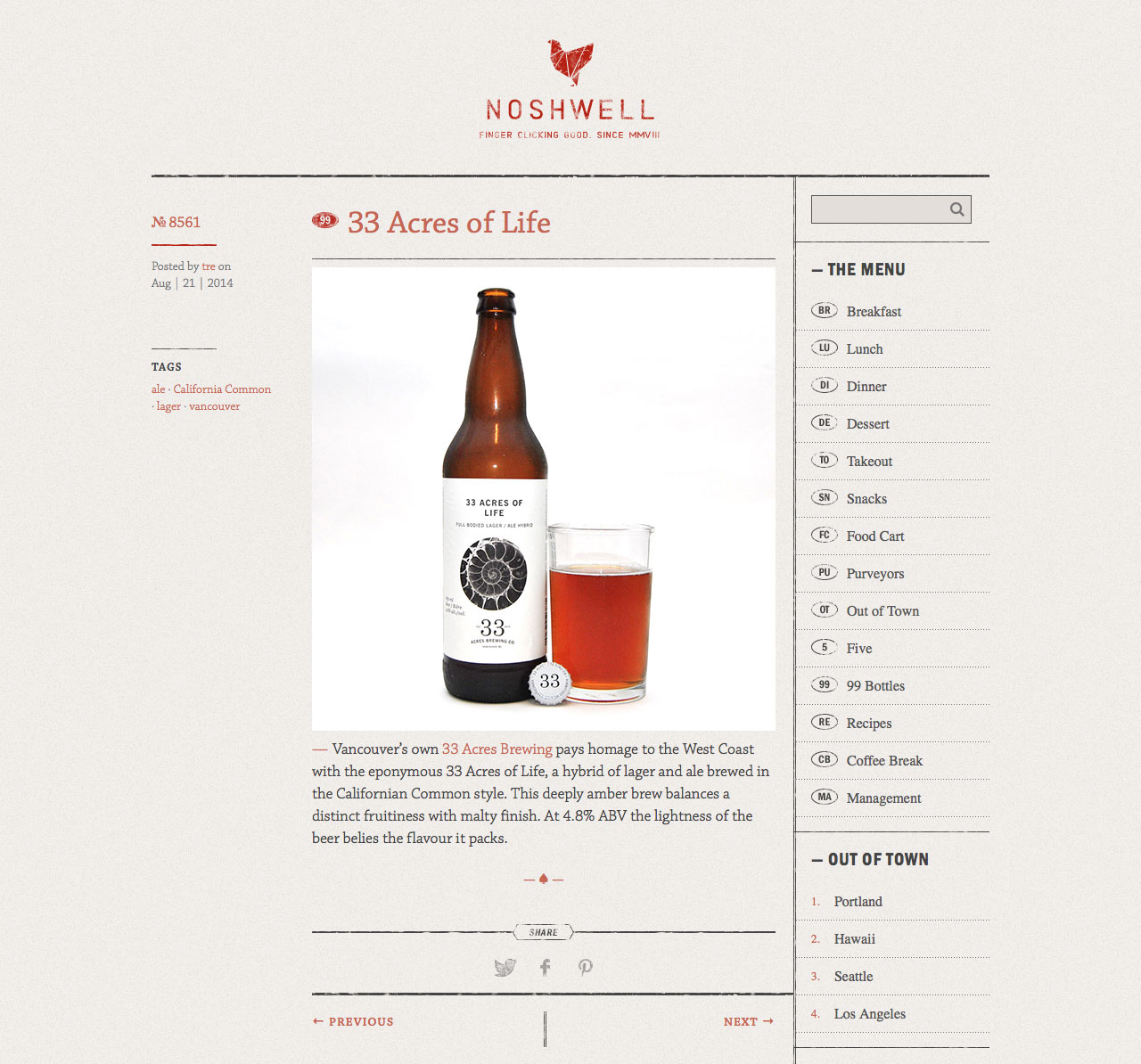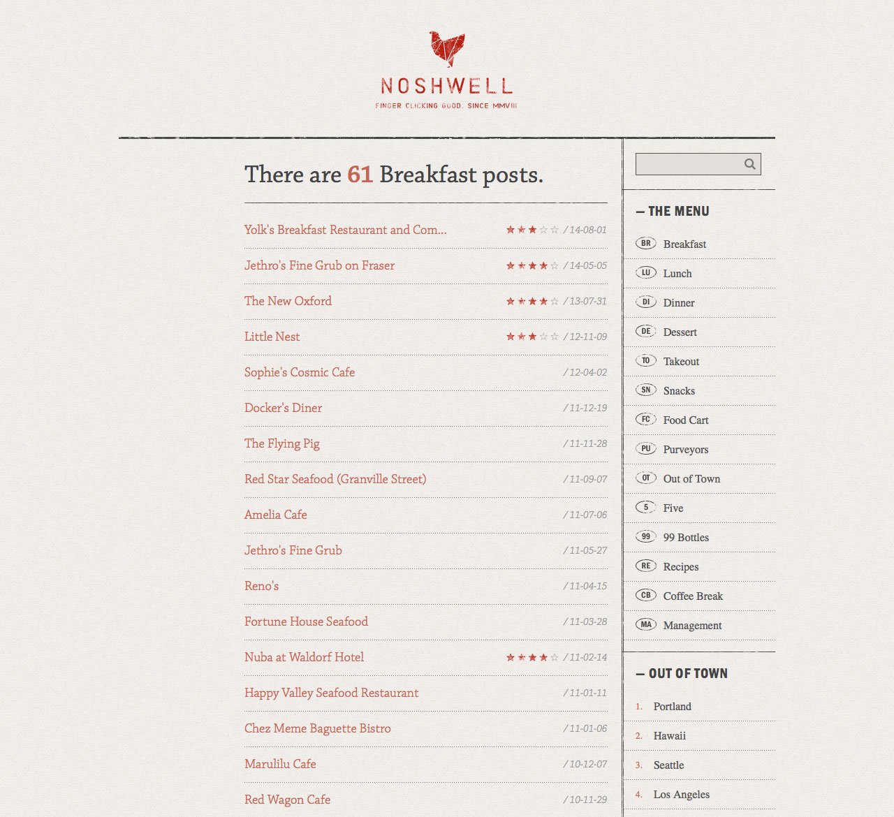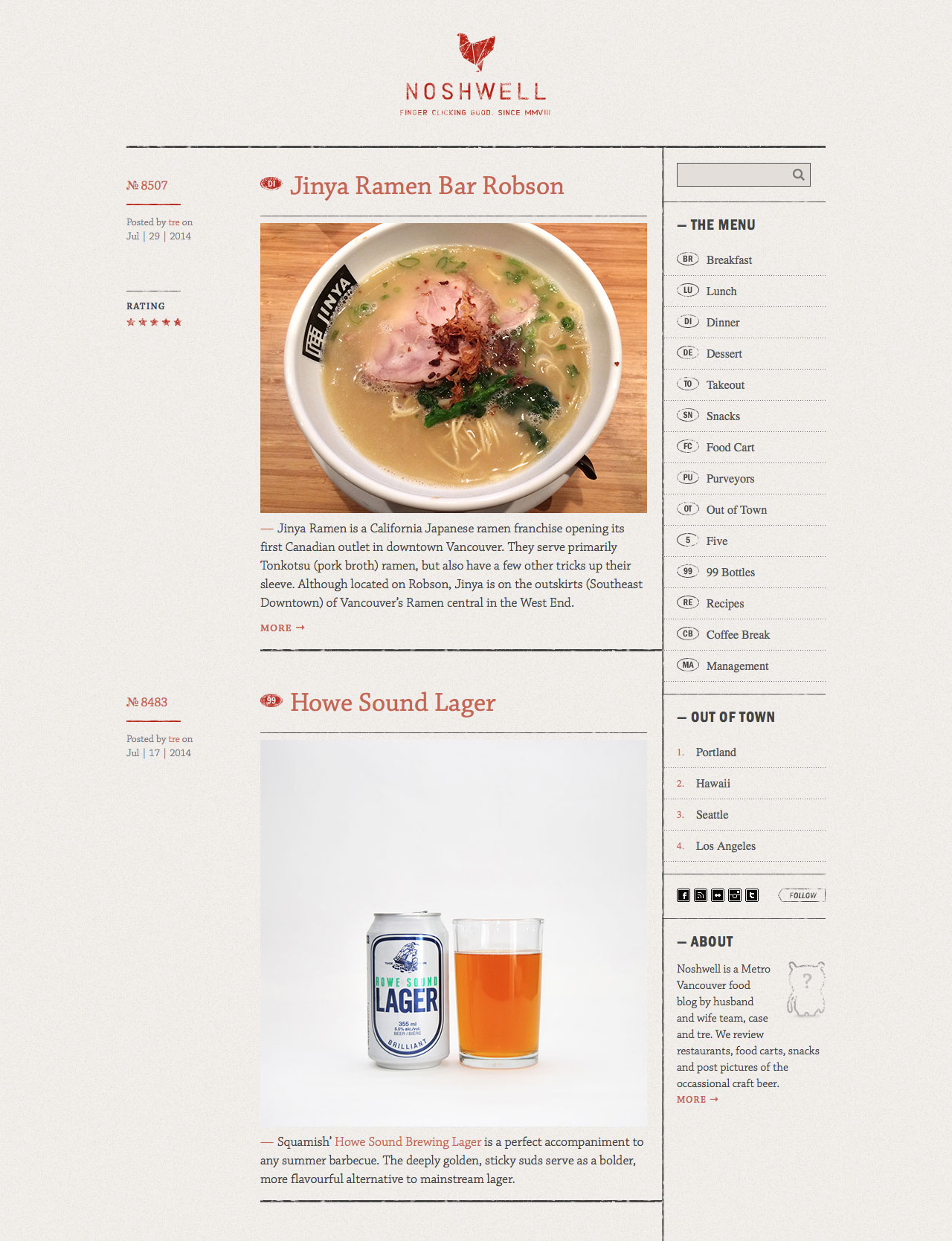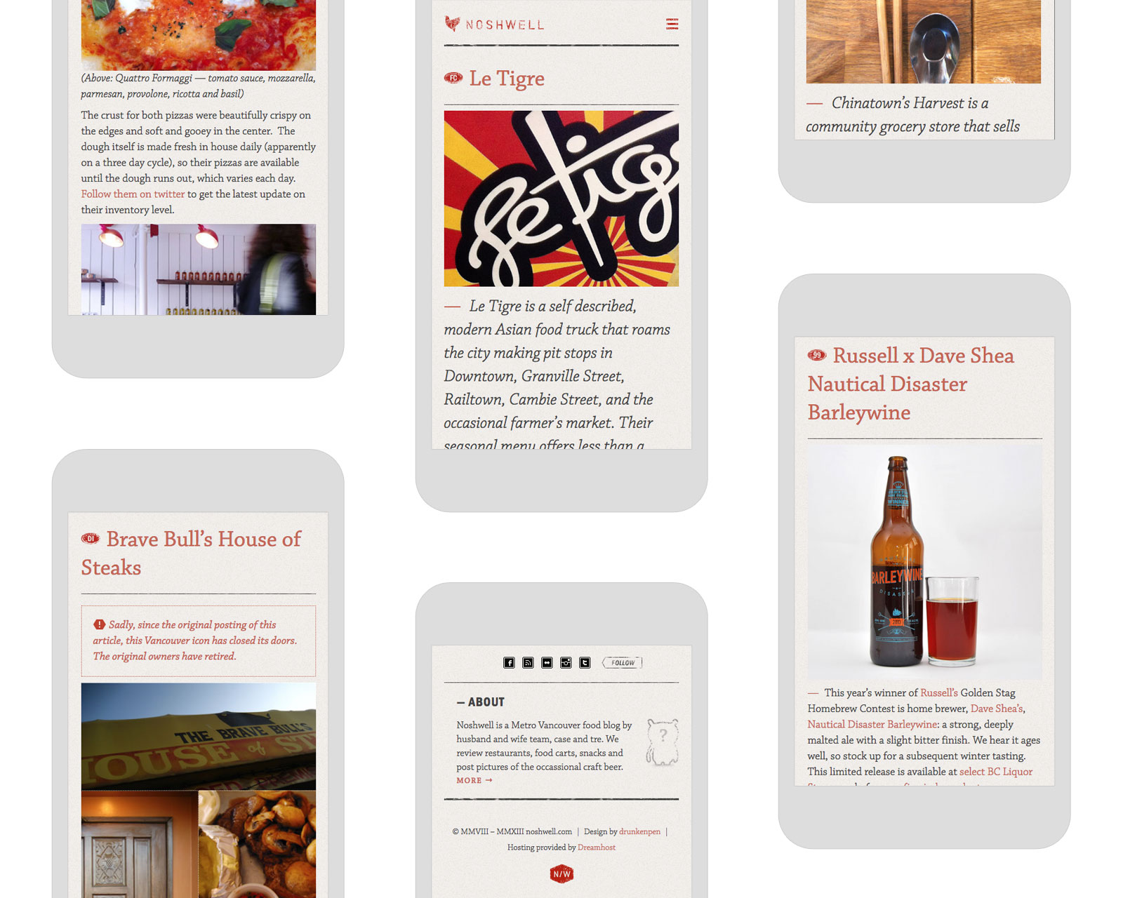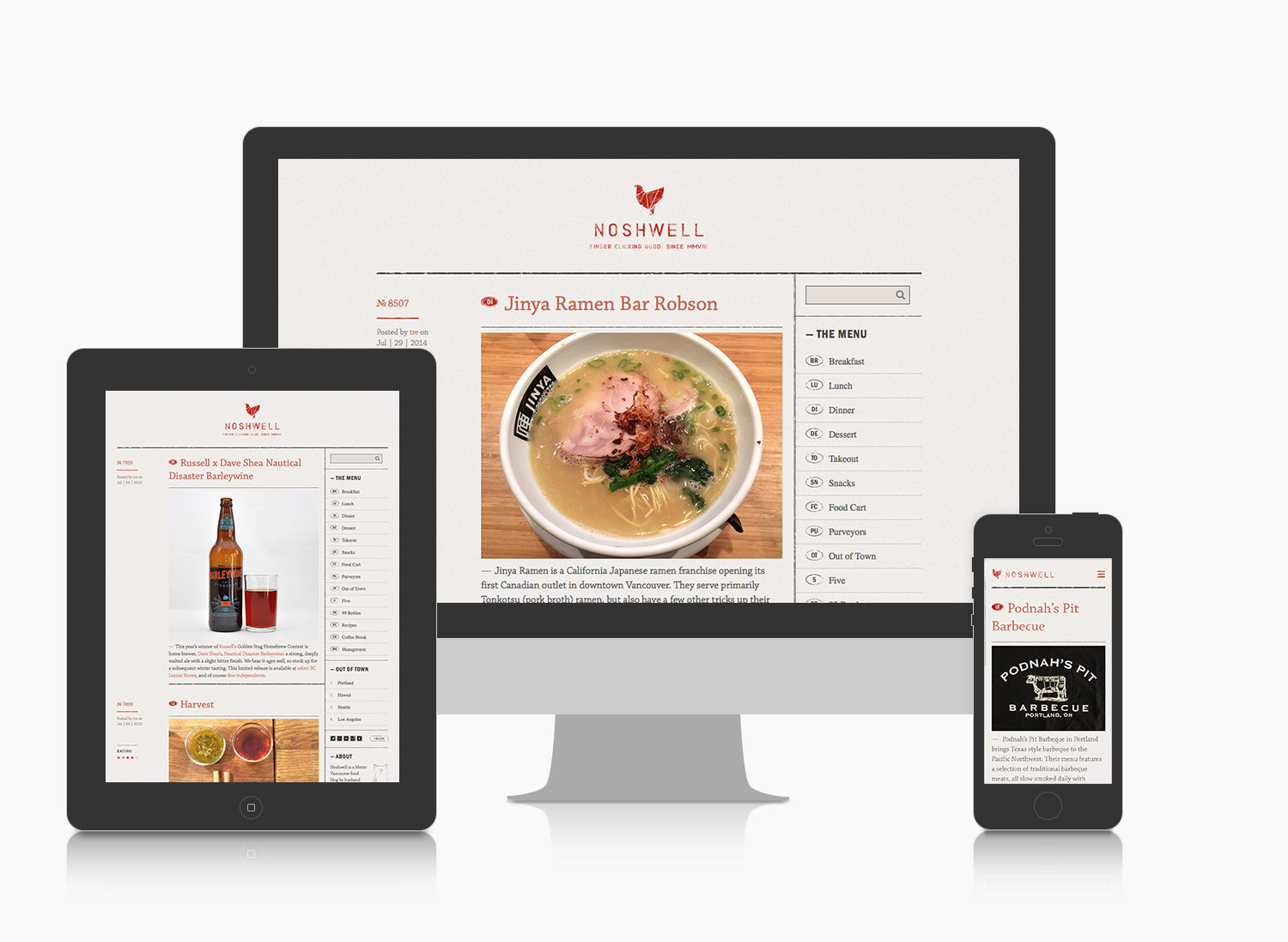 Noshwell is a food blog collaboration with my wife and co-author. It was active between 2004-2014. Thematically, I was influenced by utilitarian graphics found in various food industries: labelling, guest checks and dim sum ordering forms. The logo—a paper folded chicken—respresents a universal symbol of sustenance and also holds a hidden pulp cultural reference.